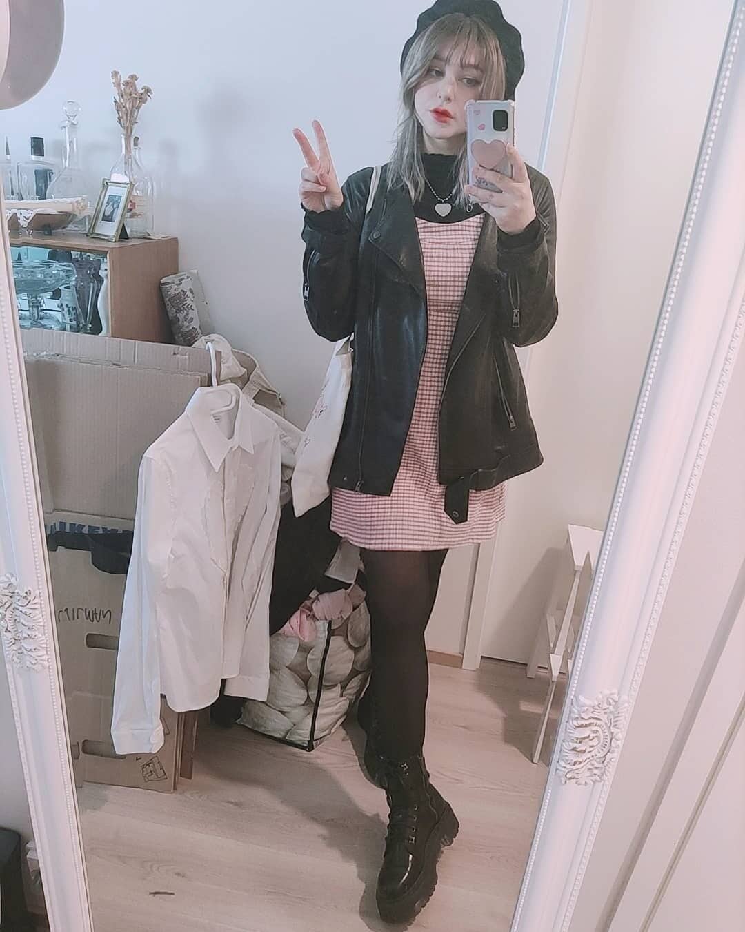 This outfit perfectly blends preppy elements with an edgy twist, making it a standout choice for the fashion-forward student. The gingham dress in soft pink exudes classic prep style, while the black leather jacket adds a rebellious edge.