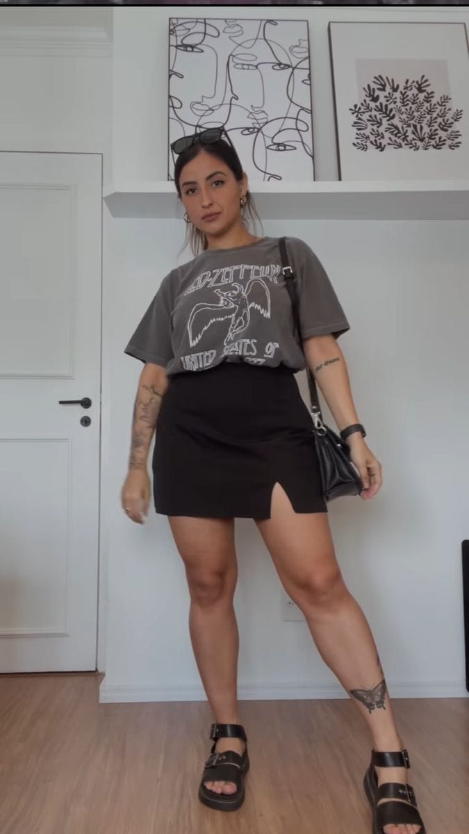 This timeless back-to-school look combines the edgy appeal of a vintage-inspired rock band t-shirt with a sleek black mini skirt. The oversized graphic tee, featuring a classic band logo, adds a touch of rebellious cool to the outfit.