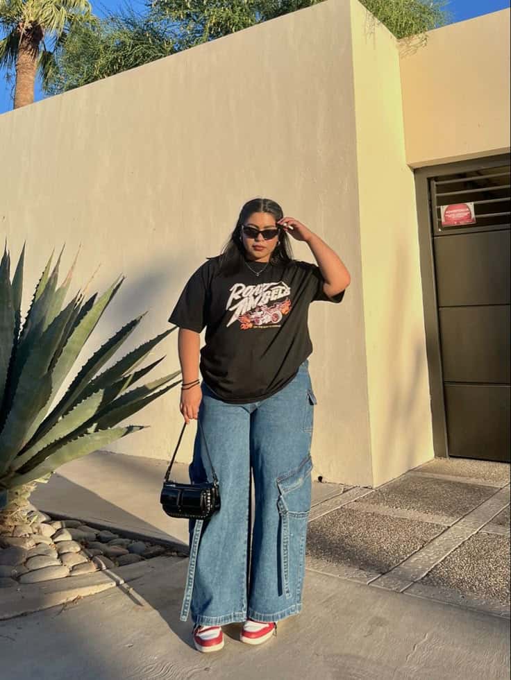 Paired with a simple black tee and high-waisted, rolled-up mom jeans, this outfit strikes the ideal balance between comfort and cool. The classic Vans sneakers complete the look with a touch of skater-inspired nostalgia.