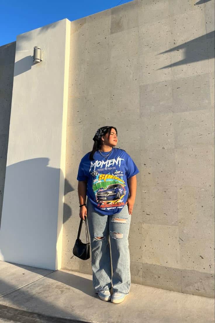 This retro-inspired look perfectly captures the essence of 90s casual cool, making it a timeless back-to-school outfit. The oversized blue graphic tee featuring a vibrant car design adds a pop of color and personality, while the light-wash ripped jeans offer a relaxed, lived-in vibe.