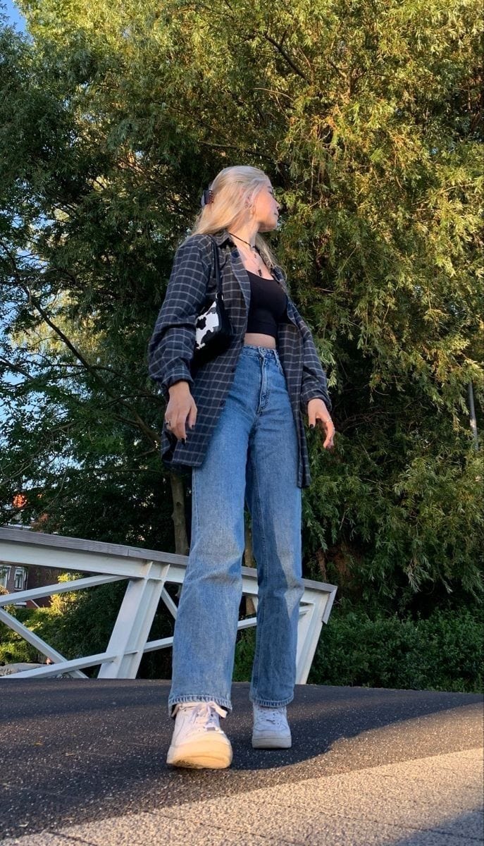 Paired with high-waisted, loose-fitting jeans and chunky white sneakers, this look is a modern take on a classic retro style. The combination of plaid and denim is a timeless choice that has been popular in school settings for decades, making it an ideal addition to our vintage-inspired back-to-school fashion list.