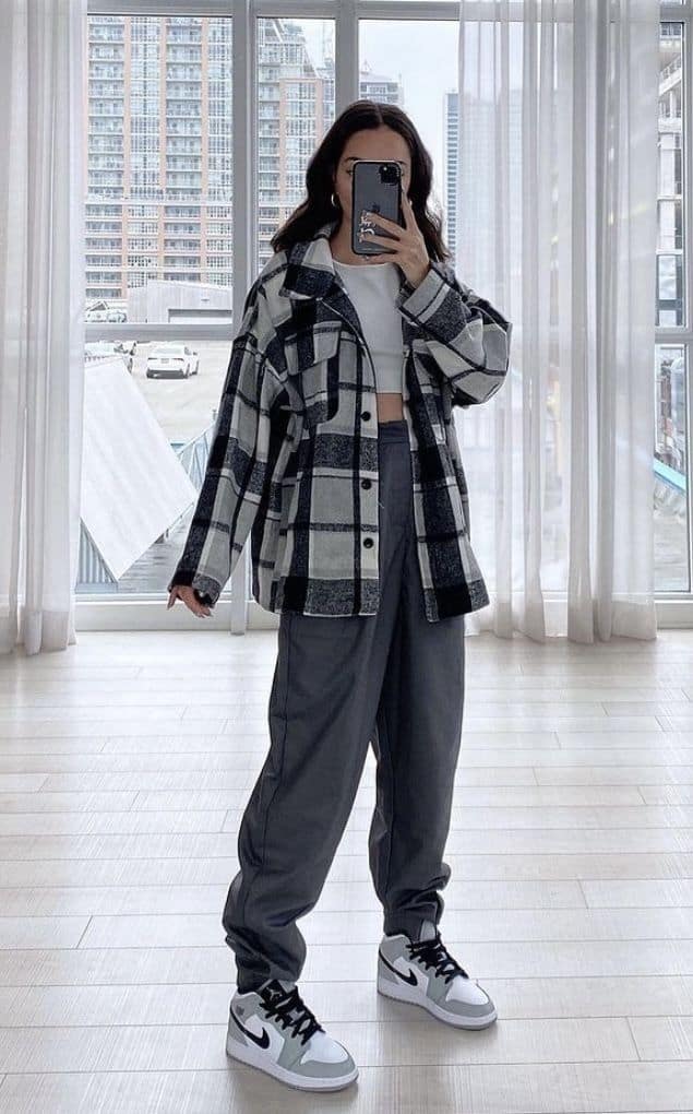 This outfit perfectly encapsulates the ’90s grunge aesthetic that’s making a major comeback in school hallways. The oversized plaid shirt layered over a cropped black top exudes a casual, effortless vibe that’s both comfortable and stylish.
