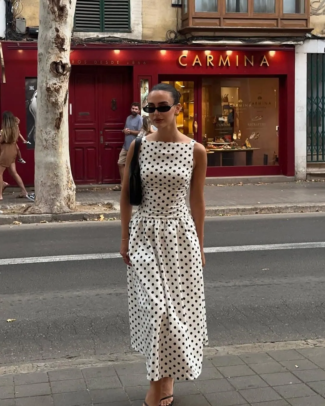 Paired with sleek sunglasses and minimalist accessories, this outfit strikes the perfect balance between sophistication and playfulness. The midi length is versatile enough for various party settings, from casual garden gatherings to more formal evening affairs.