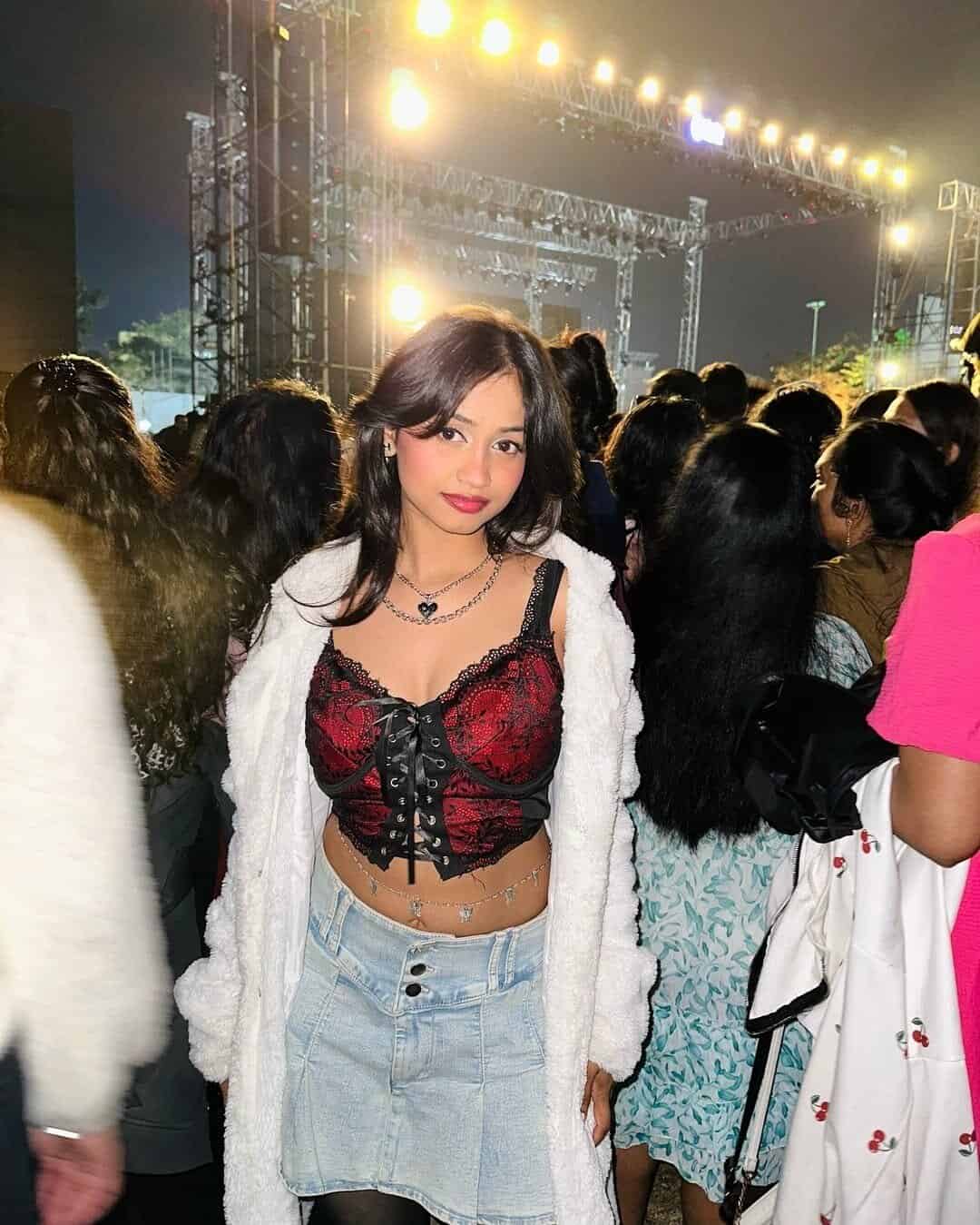 This eye-catching ensemble perfectly balances edgy and comfort for an unforgettable concert look. The striking red and black lace corset top serves as a bold centerpiece, exuding confidence and style.