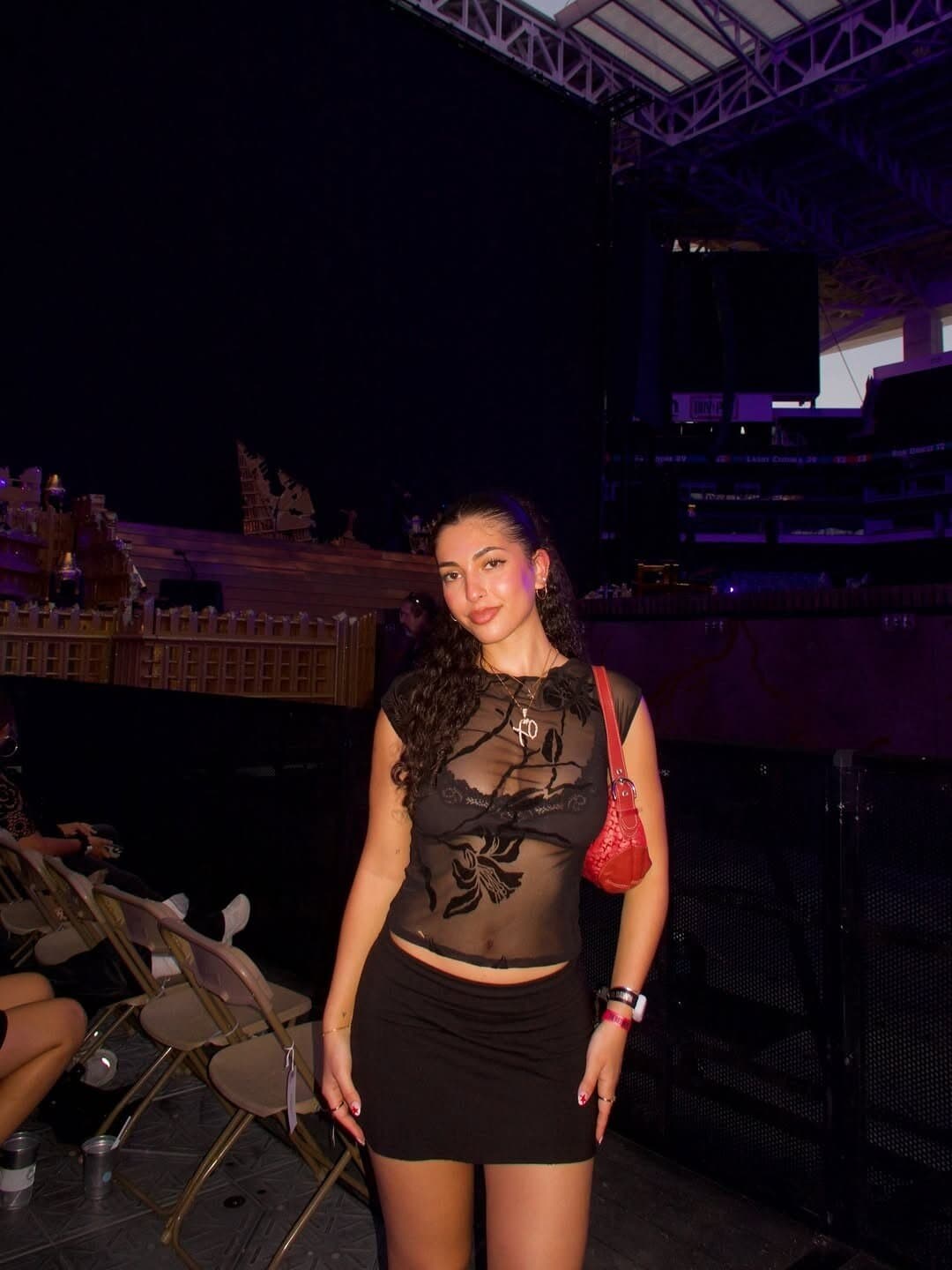 This concert outfit exudes confidence and style, perfectly balancing edgy and chic elements. The sheer black top with intricate patterns adds a touch of mystery and allure, while the fitted black mini skirt showcases a sleek silhouette.