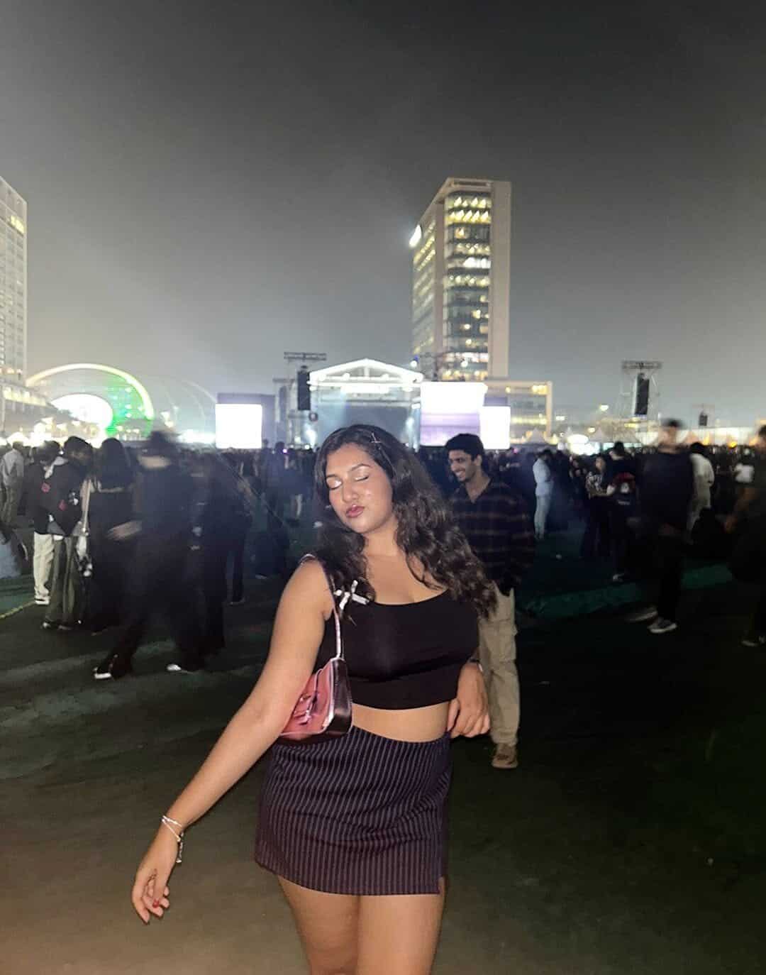 This eye-catching ensemble proves that sometimes less is more when it comes to concert attire. The sleek black crop top paired with a purple striped mini skirt creates a bold, yet effortlessly cool look thats perfect for dancing the night away.