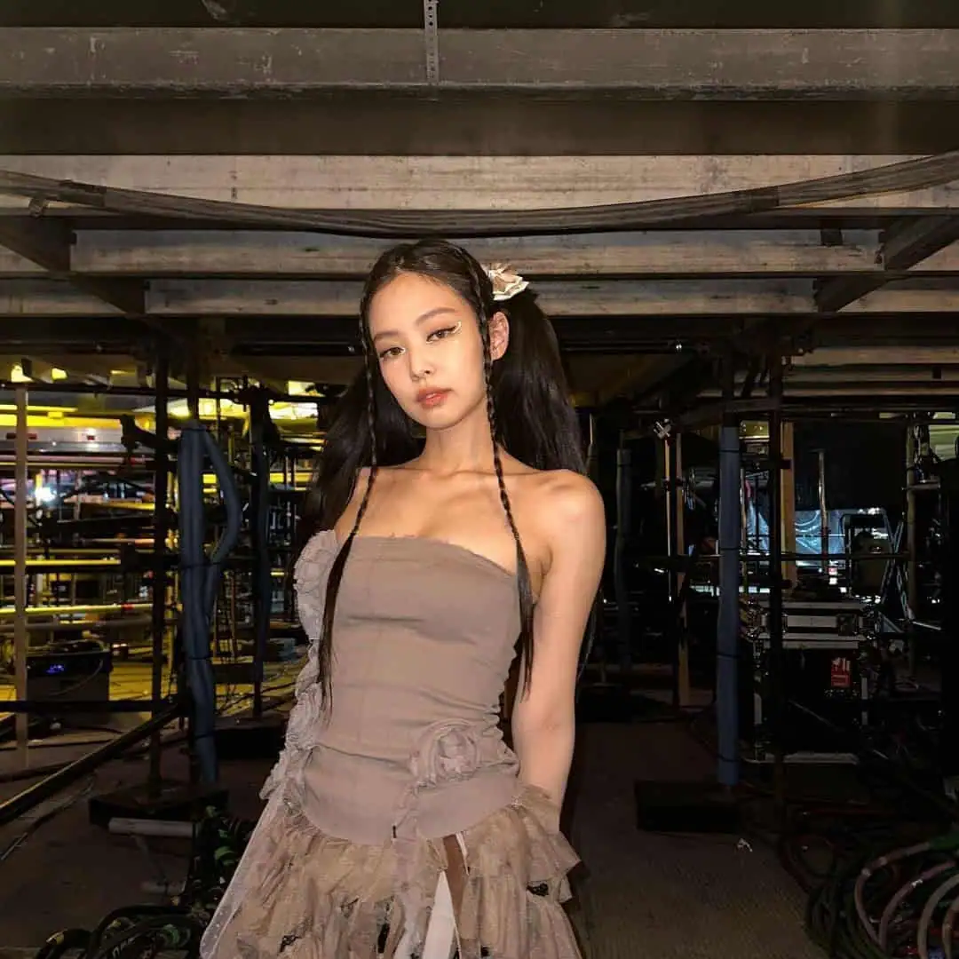 This outfit proves that you dont need flashy colors or elaborate designs to turn heads a well-fitted, monochromatic look can be just as impactful, especially when set against the vibrant lights of a concert stage.