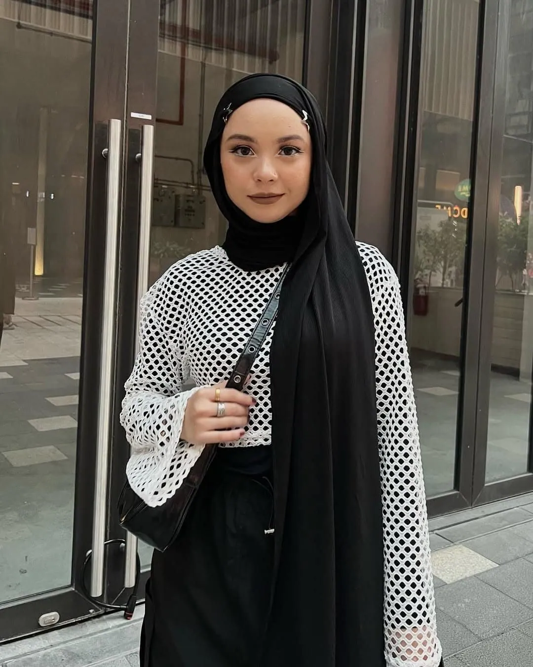 Paired with a flowing black hijab, this outfit showcases how cultural dress can be seamlessly integrated into contemporary fashion. The look is completed with subtle makeup and minimalist accessories, allowing the intricate pattern of the mesh to take center stage.