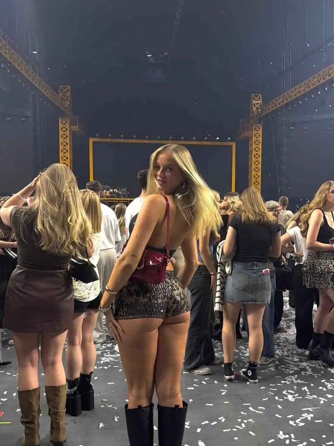 The outfit is accentuated by a chain detail, adding an edgy touch that catches the light. Set against the backdrop of a bustling concert scene with imposing stage structures and dazzling lights, this outfit embodies the perfect blend of style and practicality for a nighttime music event.