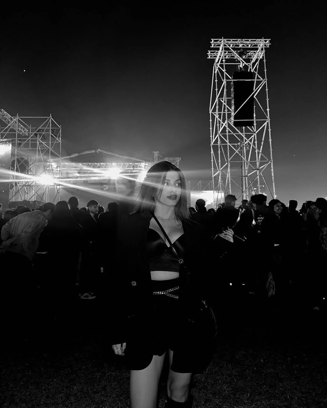 This striking black-and-white image captures the essence of a show-stopping concert outfit perfect for standing out in the crowd. The focal point is a concert-goer donning an all-black ensemble, featuring a crop top and what appears to be high-waisted shorts or a skirt.