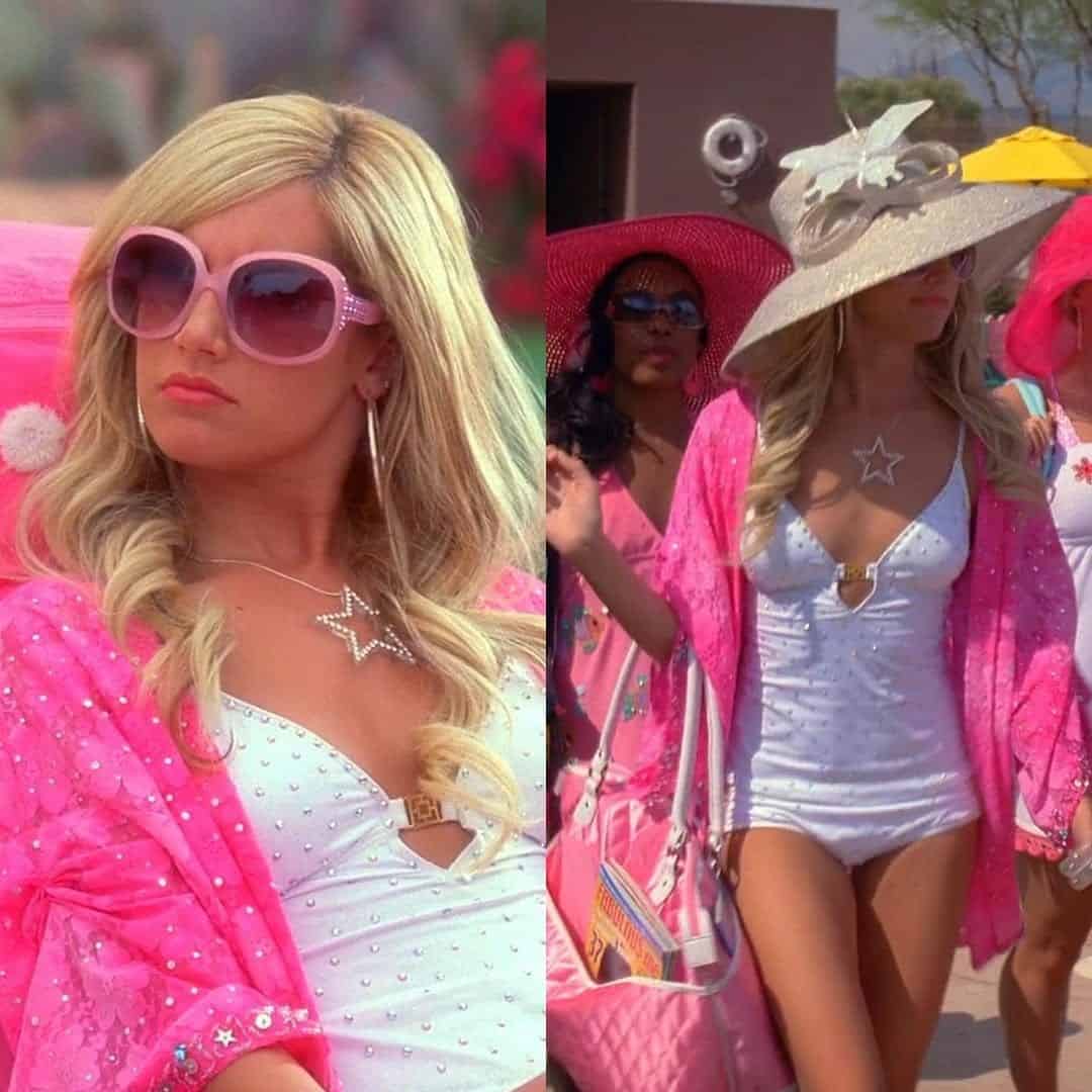 Accessorize like a star with oversized pink sunglasses, a statement star necklace, and glamorous blonde waves. This ensemble is perfect for making a splash at any high school musical pool party or summer event.