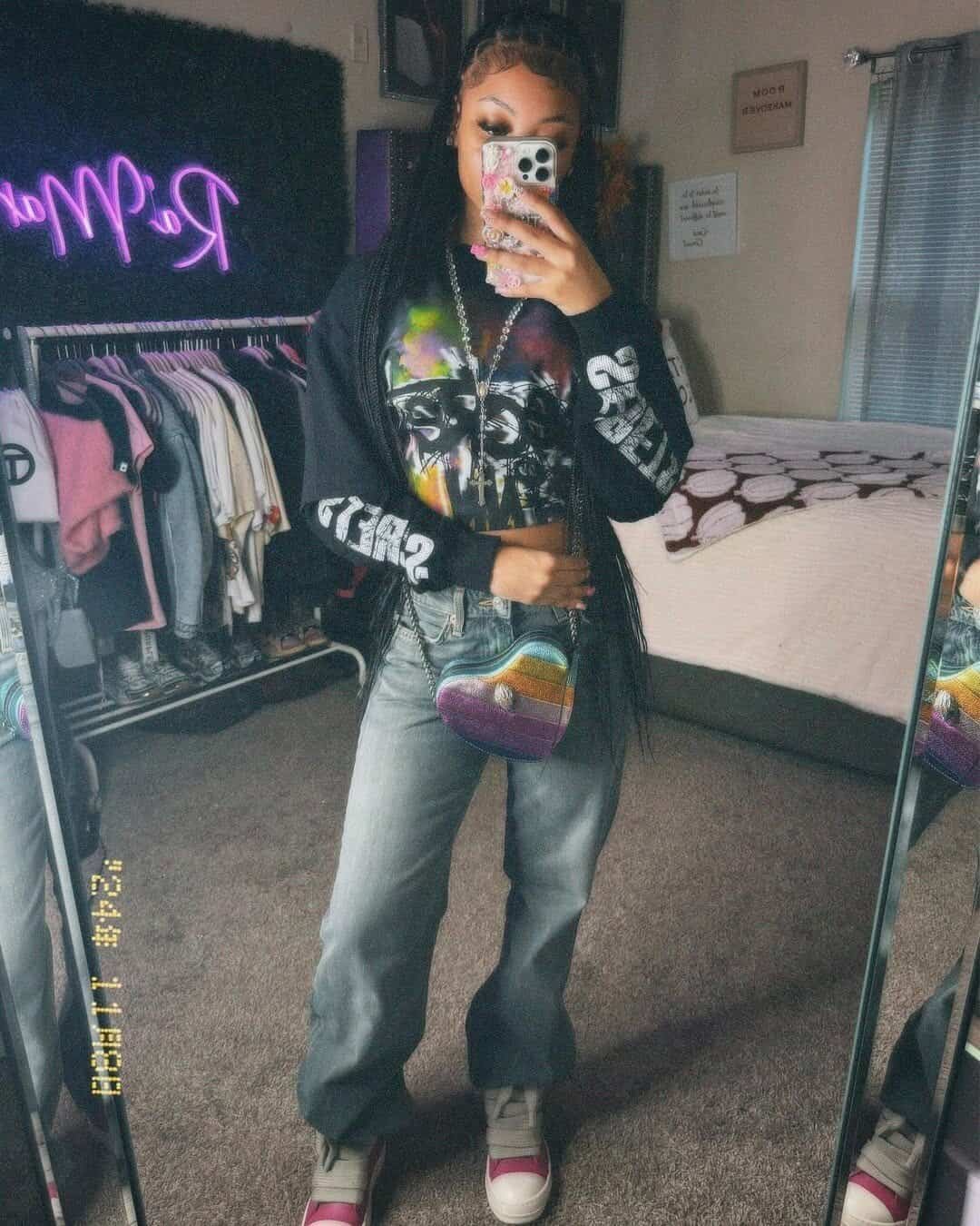 Channel your inner rebel with this show-stopping ensemble thats perfect for a High School Musical-inspired look. The eye-catching graphic tee featuring vibrant colors and bold prints adds a punch of personality, while the relaxed-fit jeans create a cool, casual vibe.