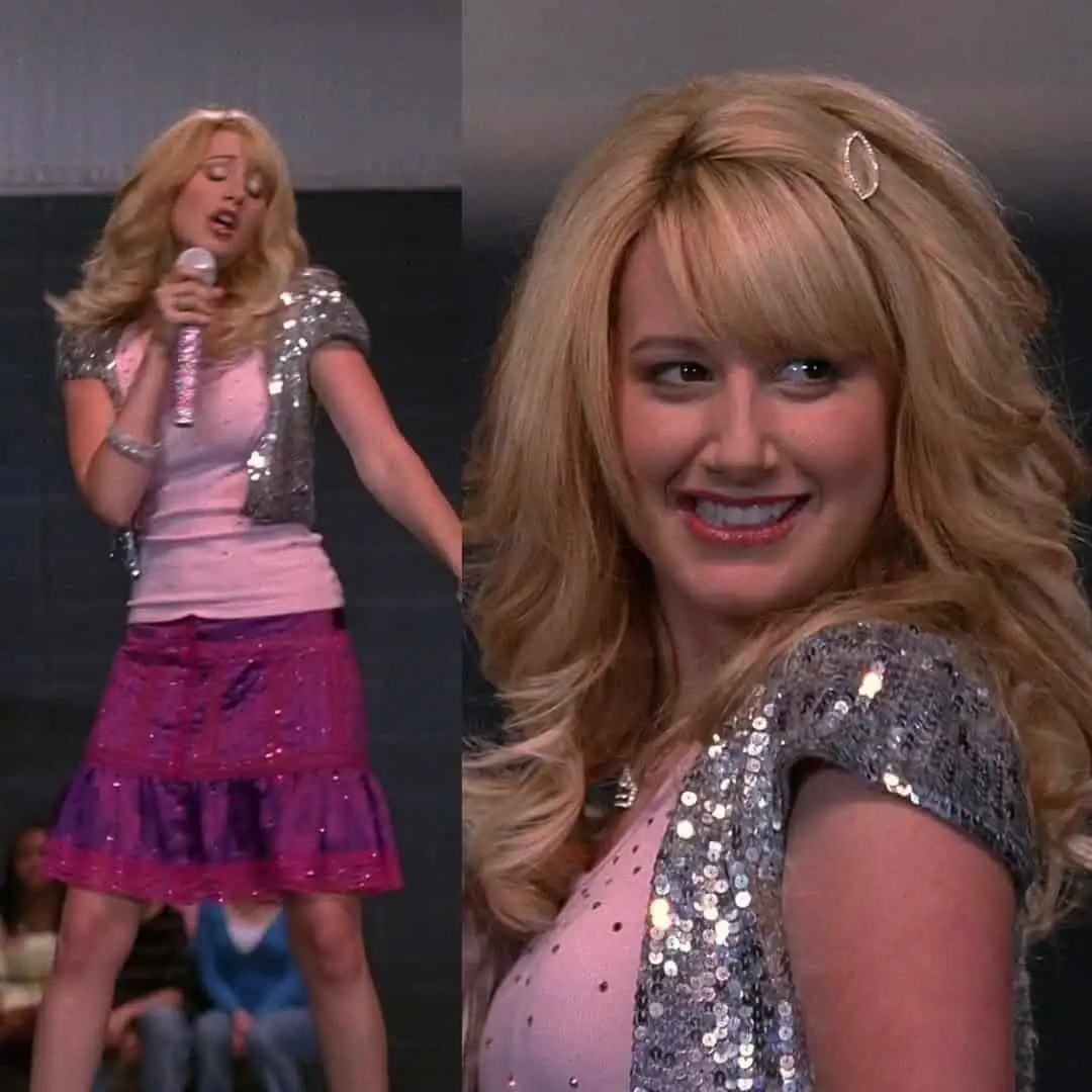 This outfit is a perfect example of how to steal the spotlight in true High School Musical fashion. The ensemble features a dazzling combination of a pink tank top layered under a short-sleeved silver sequin bolero jacket.
