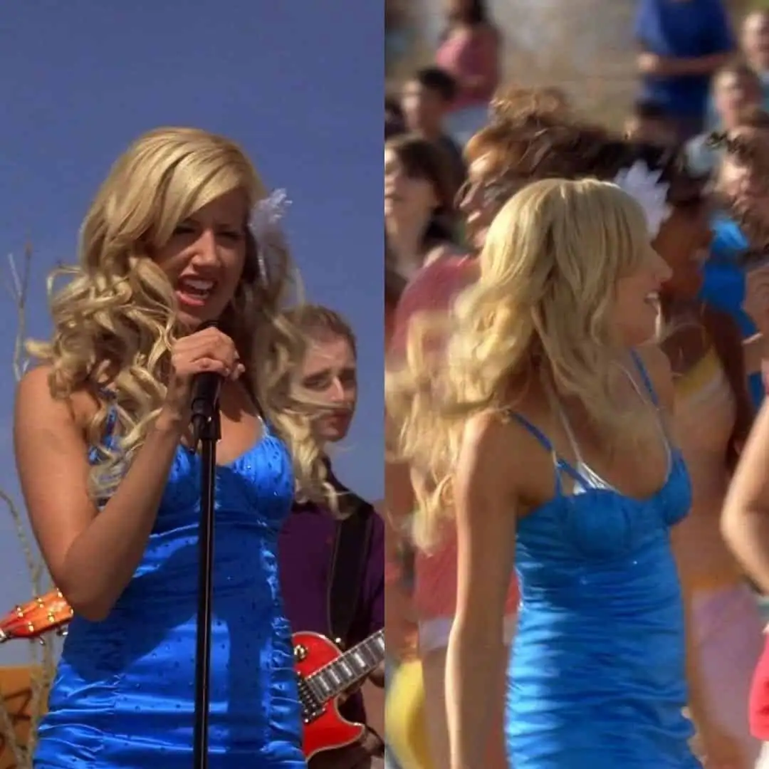 The dresss sleeveless design allows for unrestricted movement during high-energy dance numbers, making it ideal for belting out those memorable tunes. Paired with voluminous blonde curls and a white hair accessory, this ensemble captures the essence of a lead performer ready to command the stage.