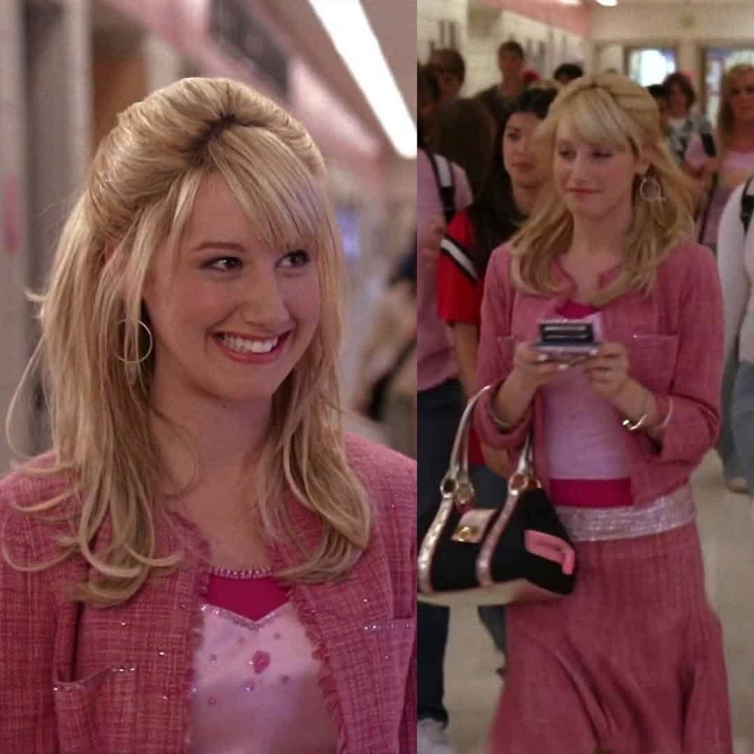 This ensemble is the epitome of High School Musical chic, featuring a dazzling pink tweed jacket layered over a sparkly pink top. The look is completed with a matching pink skirt, creating a monochromatic masterpiece thats sure to turn heads in the hallways.