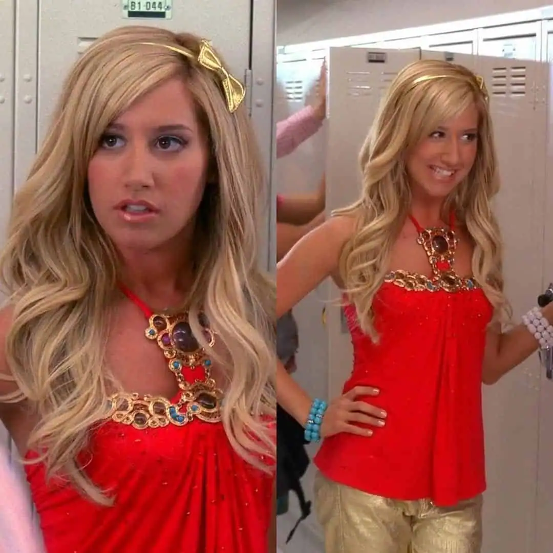 This show-stopping outfit perfectly embodies the glitz and glamour of High School Musical. The vibrant red top with subtle sparkles catches the eye immediately, while the ornate gold statement necklace adds a touch of drama and luxury.