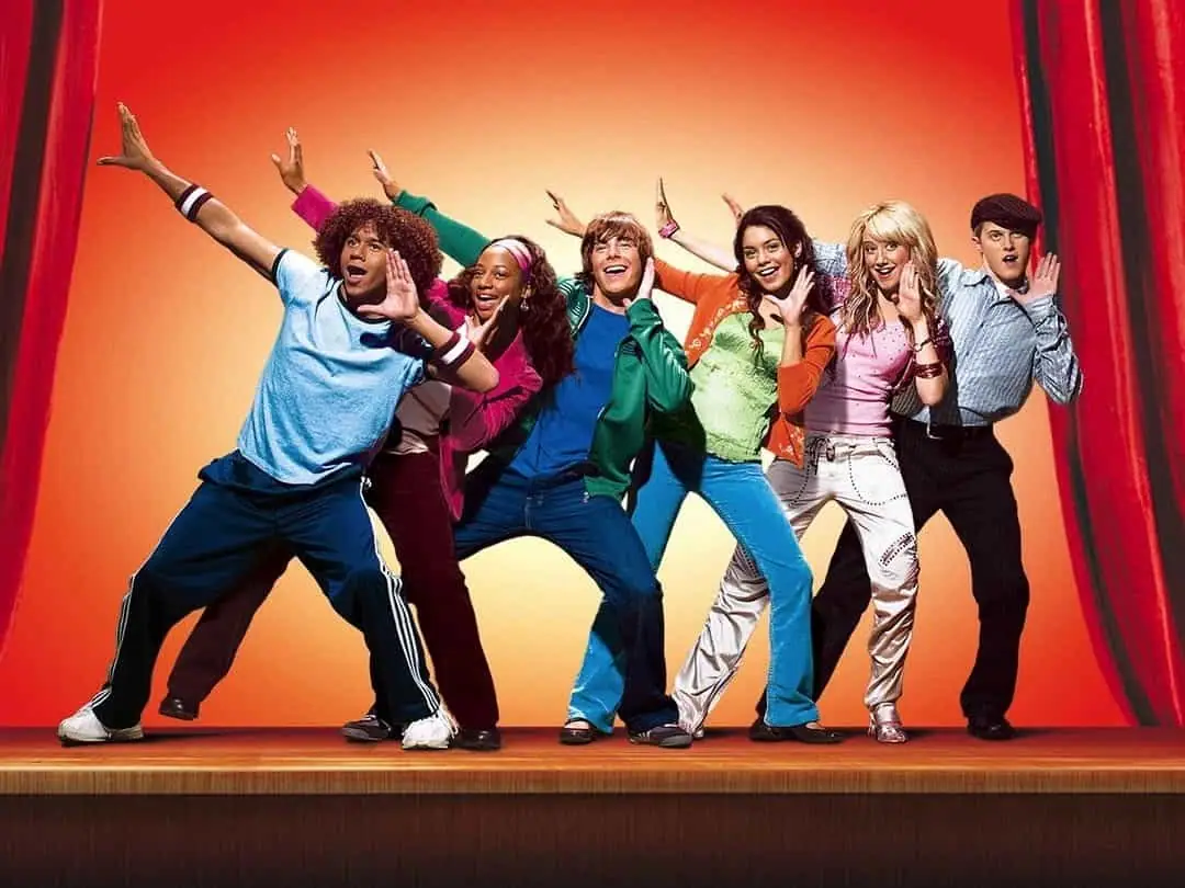 This image captures the essence of High School Musicals dynamic wardrobe choices. The cast showcases a vibrant array of colors and styles that perfectly embody the energetic spirit of a musical production.