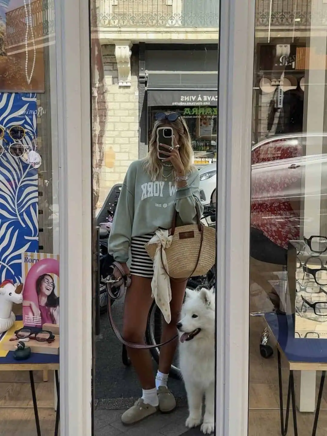 Accessorized with a trendy straw tote, sunglasses, and minimalist jewelry, this look strikes the perfect balance between effortless and put-together. The white socks and comfortable slip-ons complete the ensemble, making it ideal for navigating busy school hallways or hanging out with friends after class.
