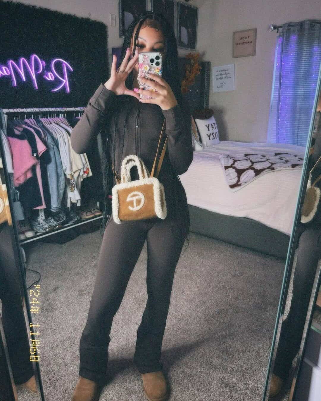 The standout accessory is the trendy mini tote bag, adorned with fuzzy trim and a designer logo, adding a touch of luxury to the look. This outfit demonstrates how to incorporate high-fashion elements into everyday wear, allowing you to channel your inner Sharpay Evans while maintaining a cool, effortless vibe.