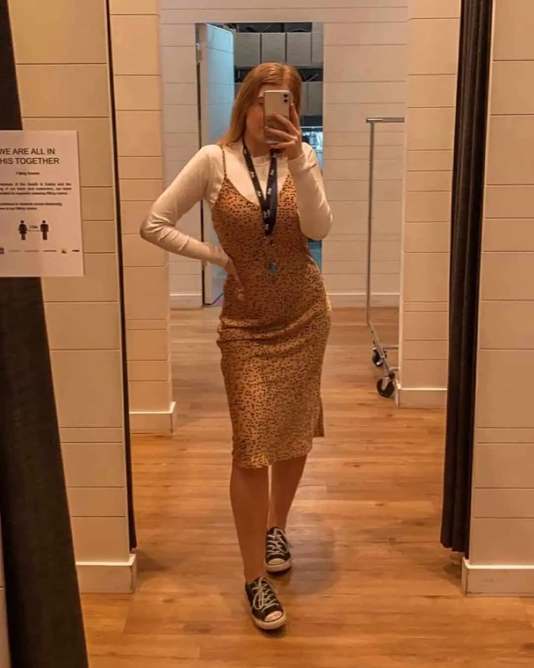 The form-fitting silhouette of the dress exudes confidence, while the sneakers add a touch of laid-back cool. This ensemble proves that you can be both comfortable and glamorous, ready to break into song and dance at a moments notice.