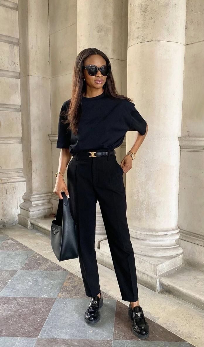 This all-black outfit exemplifies sleek professionalism with a modern twist. The loose-fitting black t-shirt tucked into high-waisted trousers creates a streamlined silhouette thats both comfortable and polished.