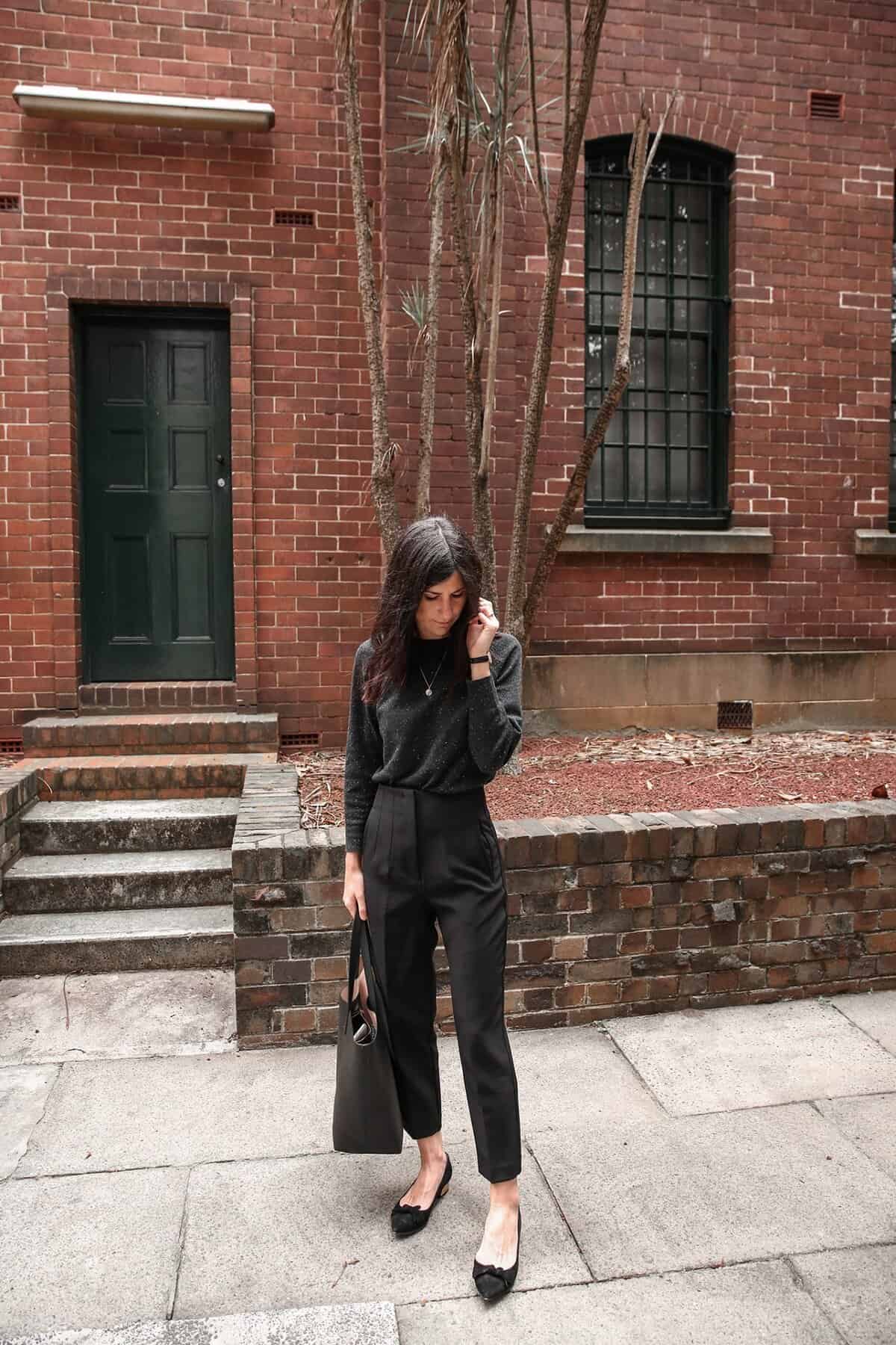 Paired with neutral-toned shoes, this outfit demonstrates how an all-black look can be both striking and understated, elevating your office style with effortless grace.