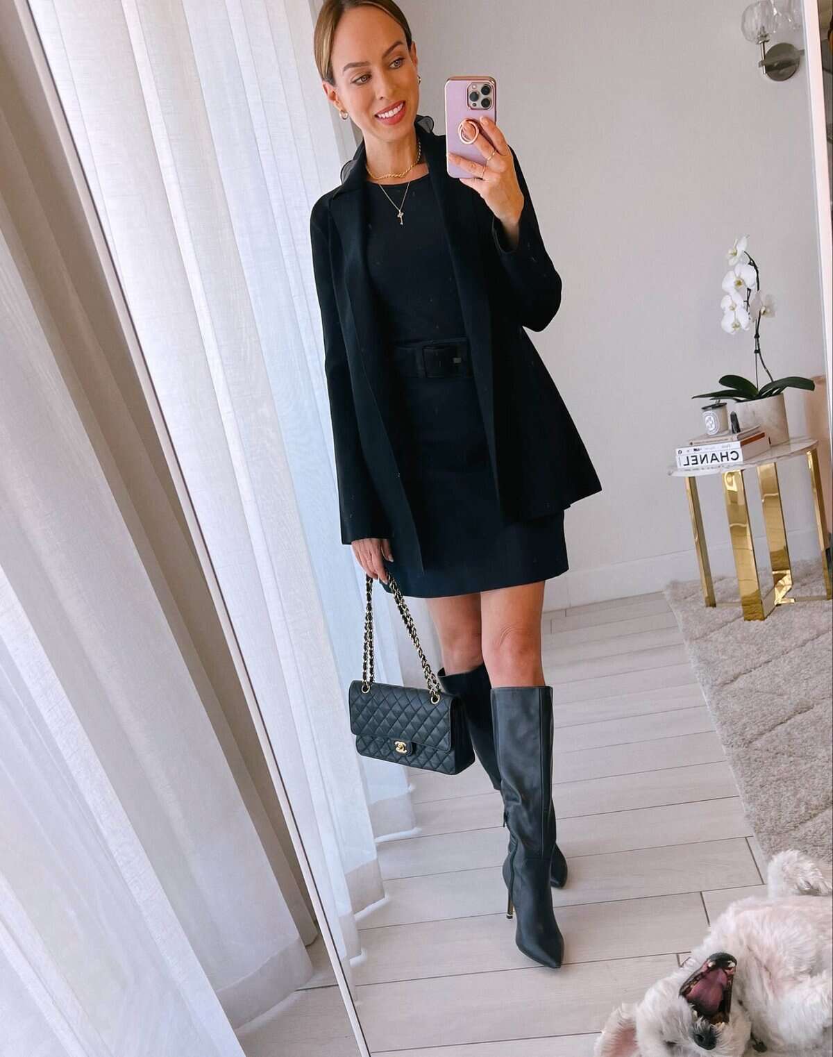 This ensemble exemplifies the power of all-black in creating a sleek, professional look with a modern edge. The tailored blazer adds structure and sophistication, while the mini dress underneath keeps the silhouette feminine and contemporary.