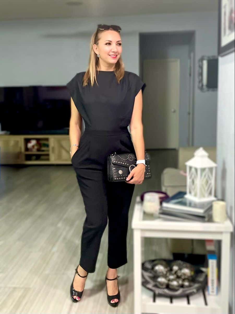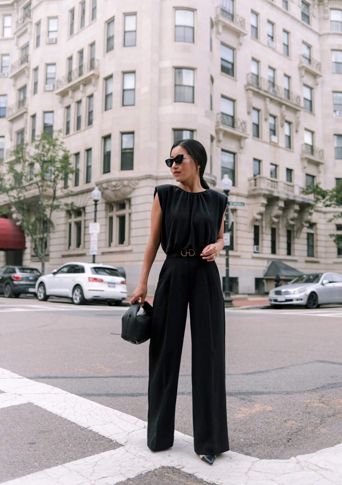 This all-black ensemble exemplifies the perfect balance of professionalism and style for the modern office. The sleek jumpsuit features a flattering mock neck and sleeveless design, ideal for layering under blazers or wearing solo in warmer weather.