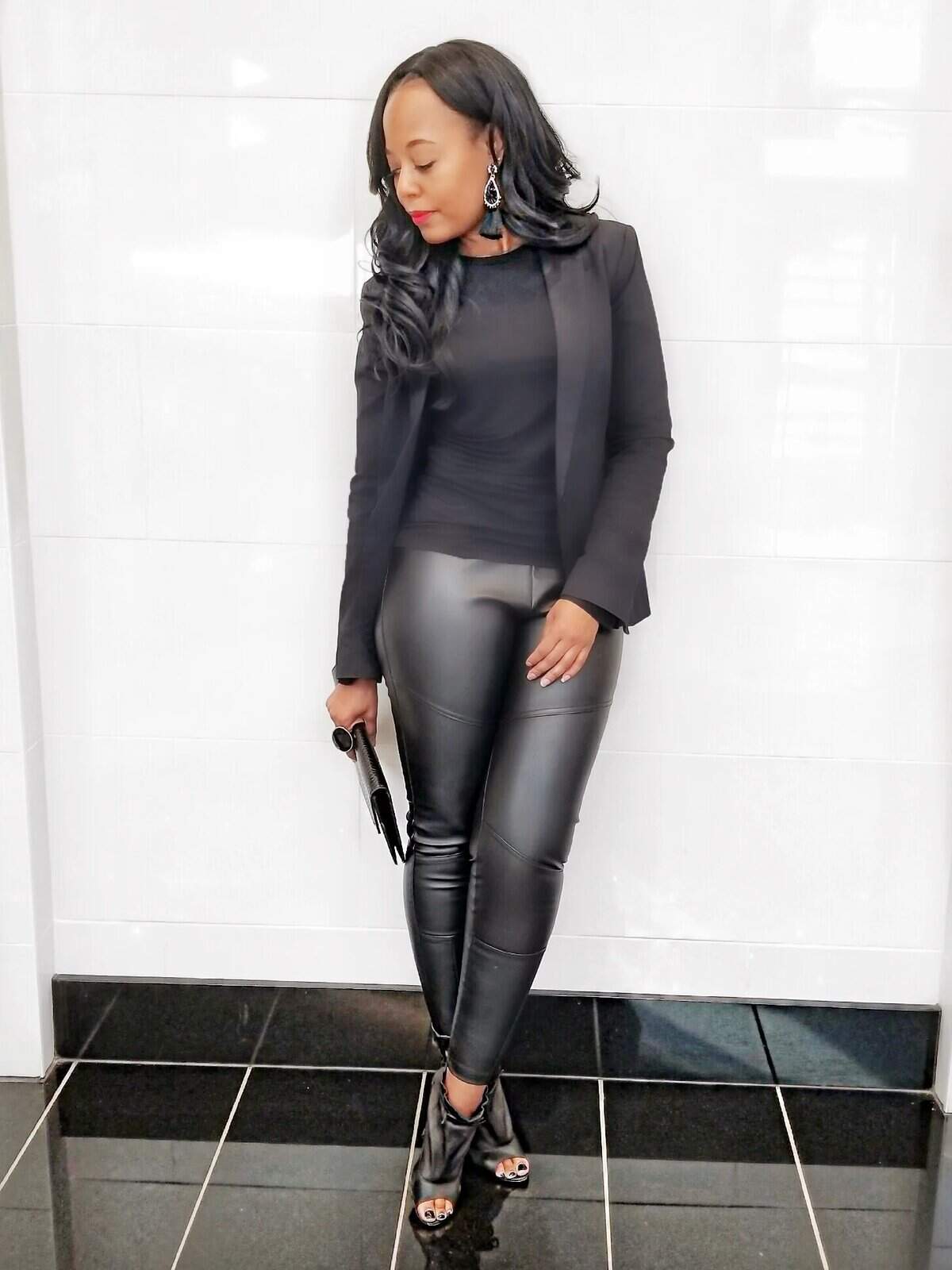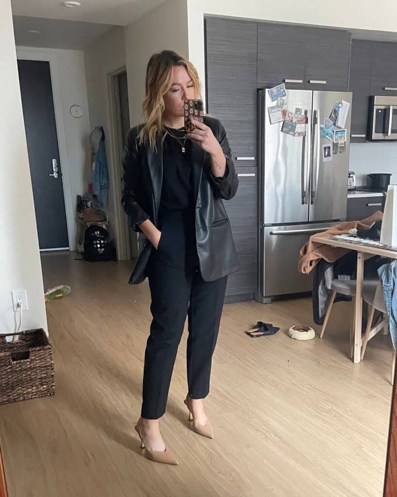 Paired with sleek leather leggings, the outfit strikes a balance between classic office wear and contemporary style. The combination of textures smooth blazer fabric against glossy leather adds depth and interest to the monochromatic look.