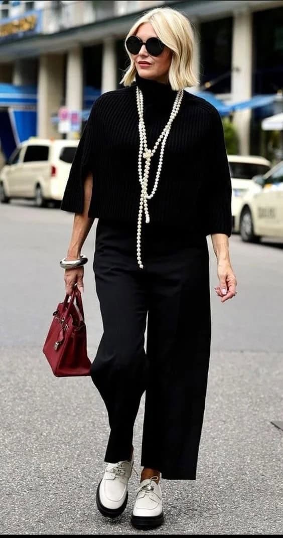Wide-leg trousers maintain the sleek look while offering comfort and professionalism. The outfits real showstopper is the long pearl necklace, adding a classic touch that brightens the monochrome palette.