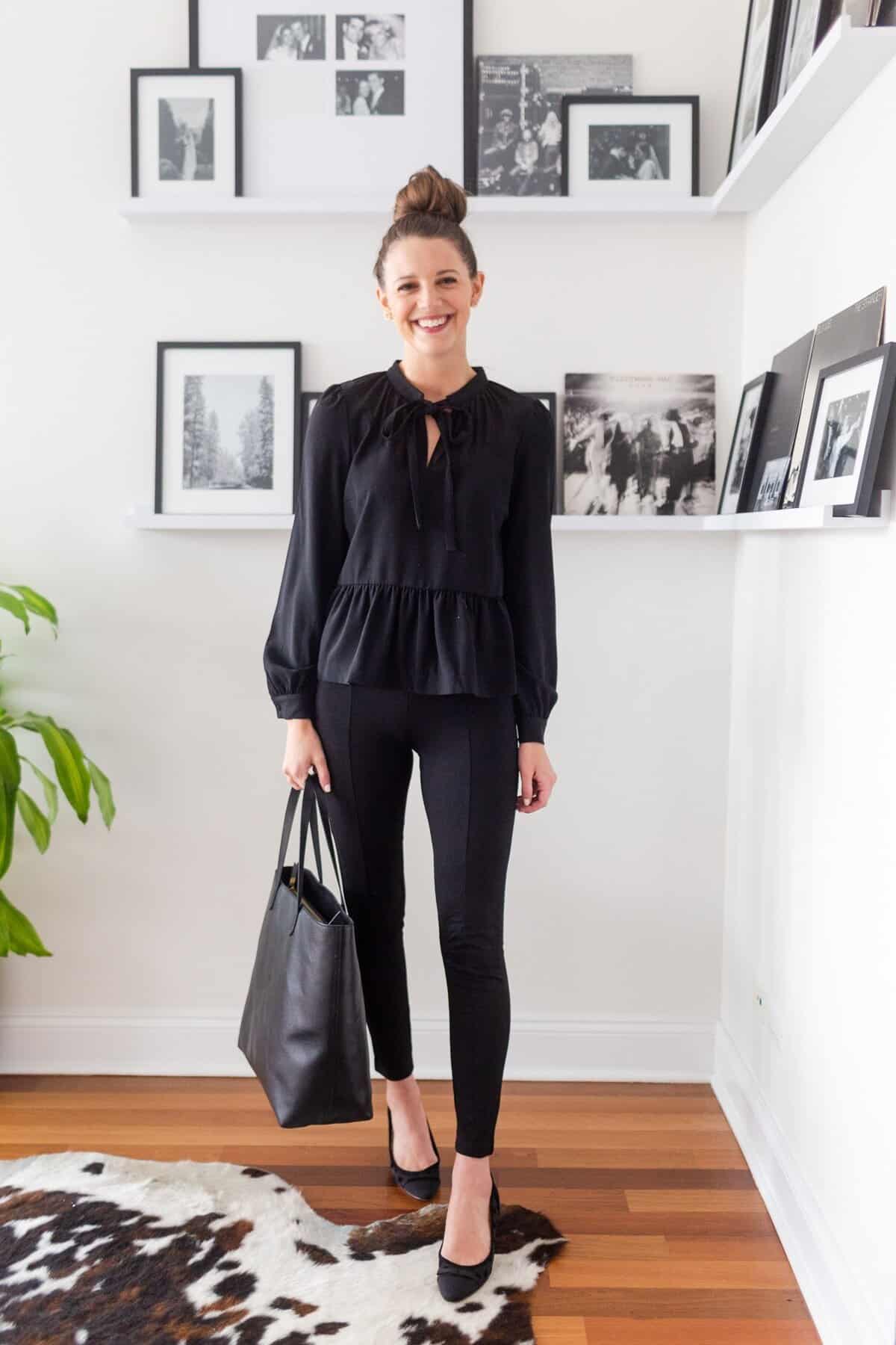 This outfit demonstrates how incorporating subtle design elements like ruffles and ties can elevate a monochromatic look, proving that all-black doesnt have to mean boring or severe in the workplace.