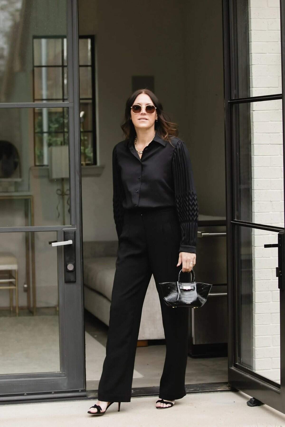 This ensemble exemplifies the power of a well-coordinated all-black outfit for the workplace. The sleek button-down shirt with its unique pleated sleeves adds a touch of sophistication and texture to the look.