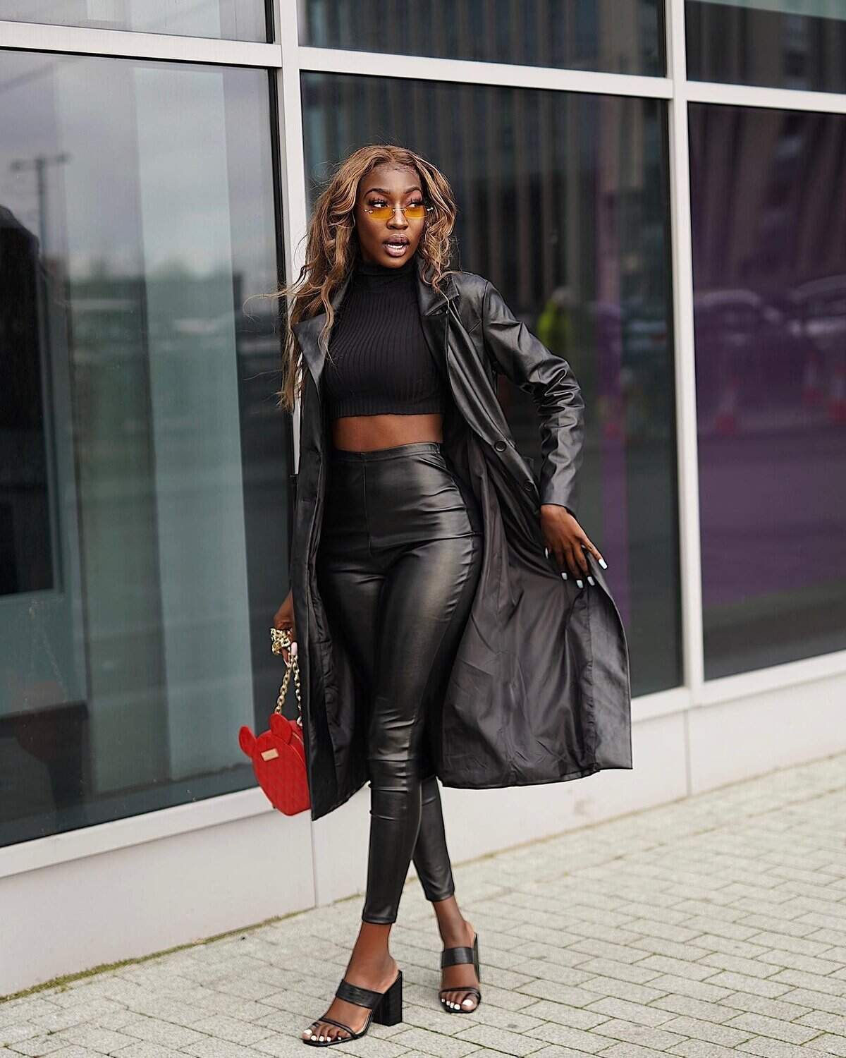 Elevate your office style with this striking all-black ensemble that exudes confidence and sophistication. The long leather coat adds a powerful silhouette, while the cropped turtleneck and high-waisted leather pants create a sleek, modern look.