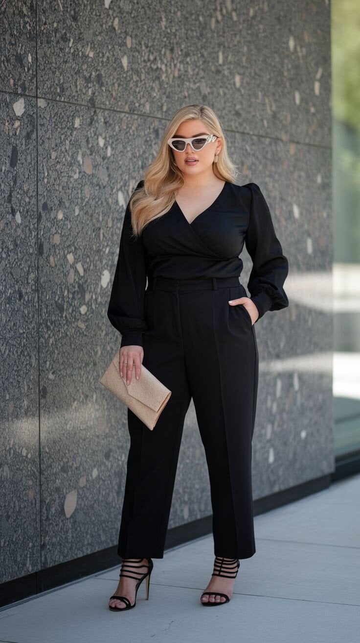 The wide-leg pants create a flattering silhouette suitable for various body types. Accessorized with trendy white sunglasses, strappy black heels, and a neutral clutch, this outfit demonstrates how an all-black ensemble can be both sophisticated and fashion-forward.