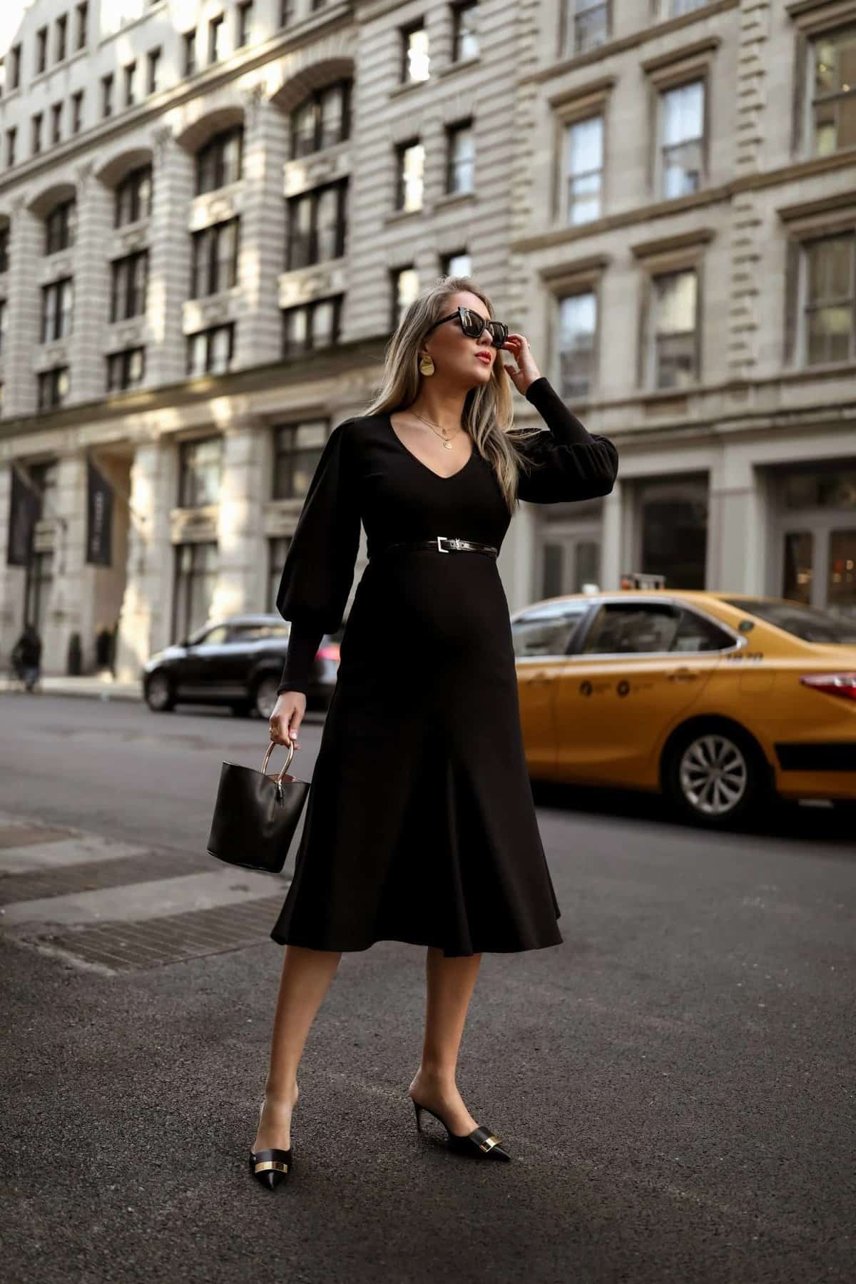 This all-black ensemble exemplifies the perfect balance of sophistication and style for the modern office. The midi-length dress with its V-neckline and billowy sleeves offers a flattering silhouette thats both professional and feminine.