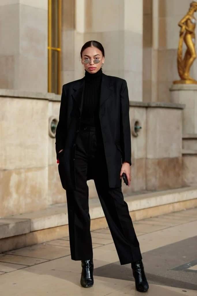 This ensemble exemplifies the power of monochromatic dressing in the workplace. The all-black outfit features an oversized blazer paired with a sleek turtleneck, creating a sophisticated silhouette that commands attention.