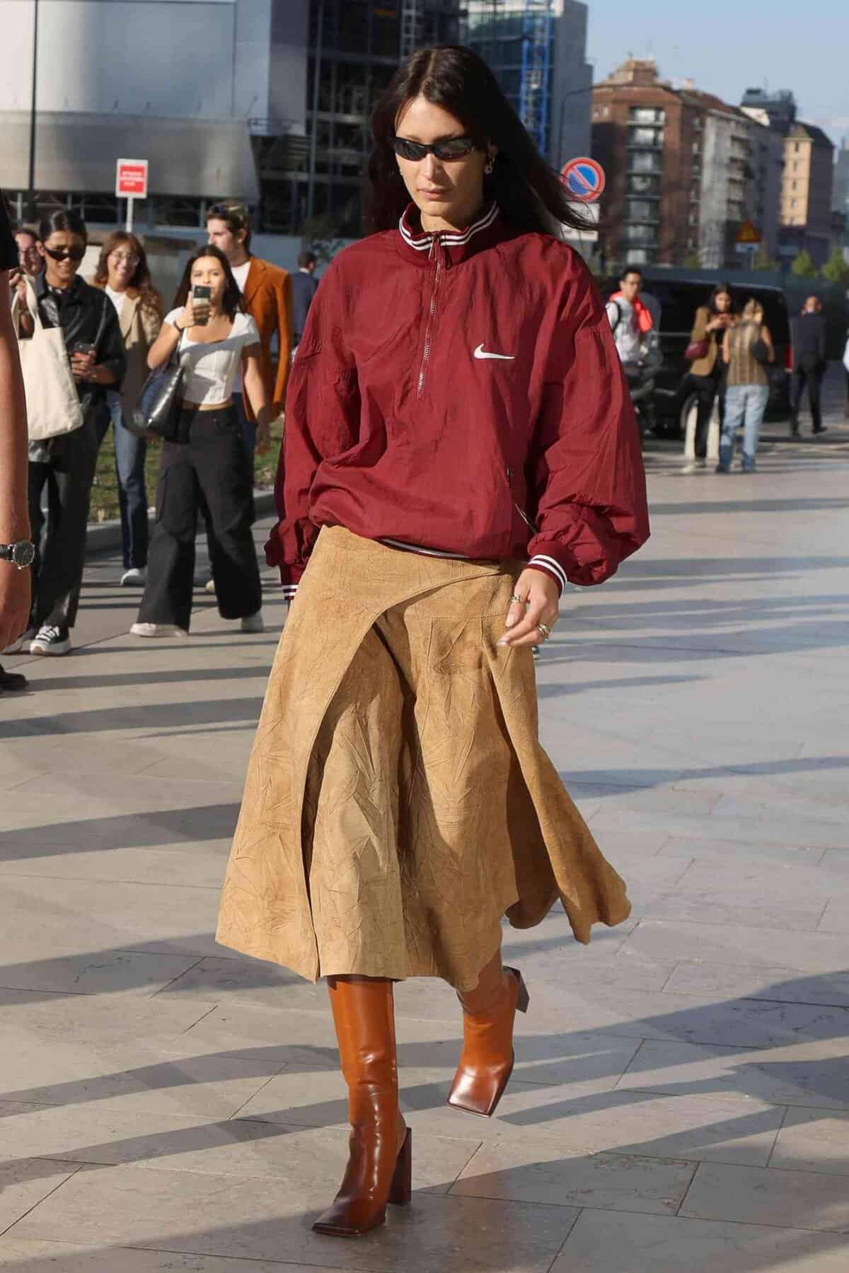 This outfit perfectly encapsulates the versatility of fall fashion, combining athletic comfort with sophisticated style. The deep burgundy Nike windbreaker adds a sporty edge while its rich autumnal hue elevates the look. Paired with a flowing tan suede midi skirt, the ensemble strikes a beautiful balance between casual and refined. The cognac leather boots complement the skirt’s earthy tone, creating a cohesive color palette ideal for the season. Dark sunglasses add a touch of mystery and glamour, completing this street-style-worthy look. This outfit demonstrates how to effortlessly blend athletic pieces with more polished elements, resulting in a fashion-forward autumn ensemble that’s both comfortable and chic.