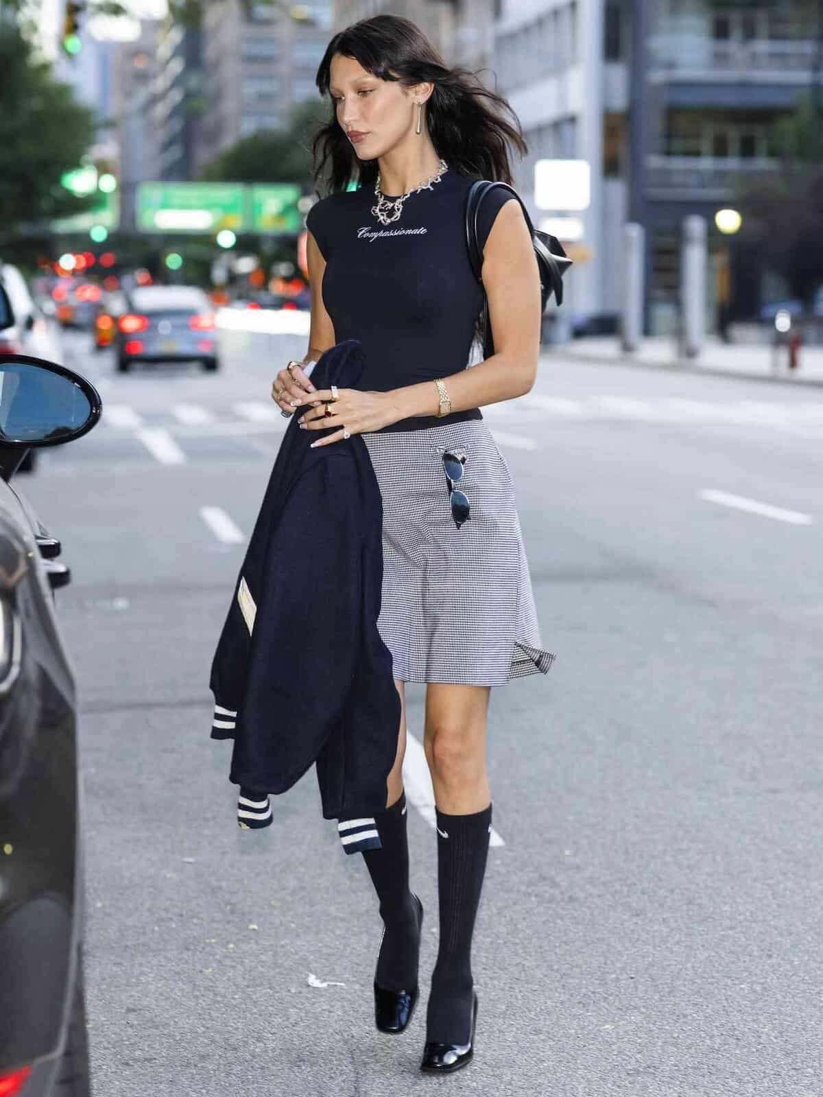 This outfit perfectly balances casual elegance with a sporty edge, making it an ideal choice for crisp autumn days. The sleek black cap-sleeve top paired with a checkered mini skirt creates a classic silhouette, while the varsity-style jacket draped over one arm adds a touch of collegiate cool. Knee-high socks and glossy black heels elevate the look from simple to sophisticated. Accessorized with a statement necklace and subtle jewelry, this ensemble demonstrates how to transition summer staples into fall by layering and incorporating darker hues. It’s a versatile look that can easily go from day to night, capturing the essence of effortless autumn style.