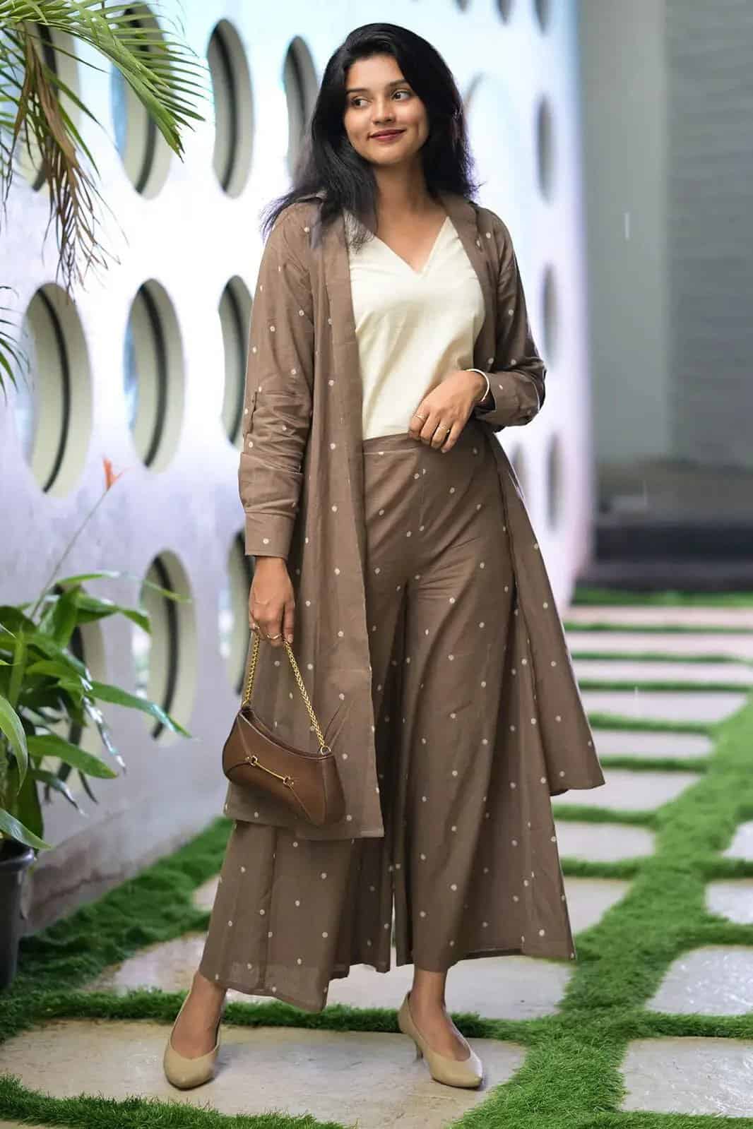 This stunning fall formal outfit combines elegance with comfort, perfect for turning heads at any seasonal event. The ensemble features a long, flowing duster coat and matching palazzo pants in a rich taupe color adorned with delicate white polka dots. The coordinated set is beautifully paired with a cream V-neck top, creating a sophisticated layered look. The neutral color palette is ideal for autumn, while the polka dot pattern adds a playful touch to the formal attire. Accessorized with a small brown handbag and nude flats, this outfit strikes the perfect balance between style and practicality. The long silhouette of the duster and wide-leg pants creates a graceful, elongating effect that’s sure to make a statement at any fall gathering.