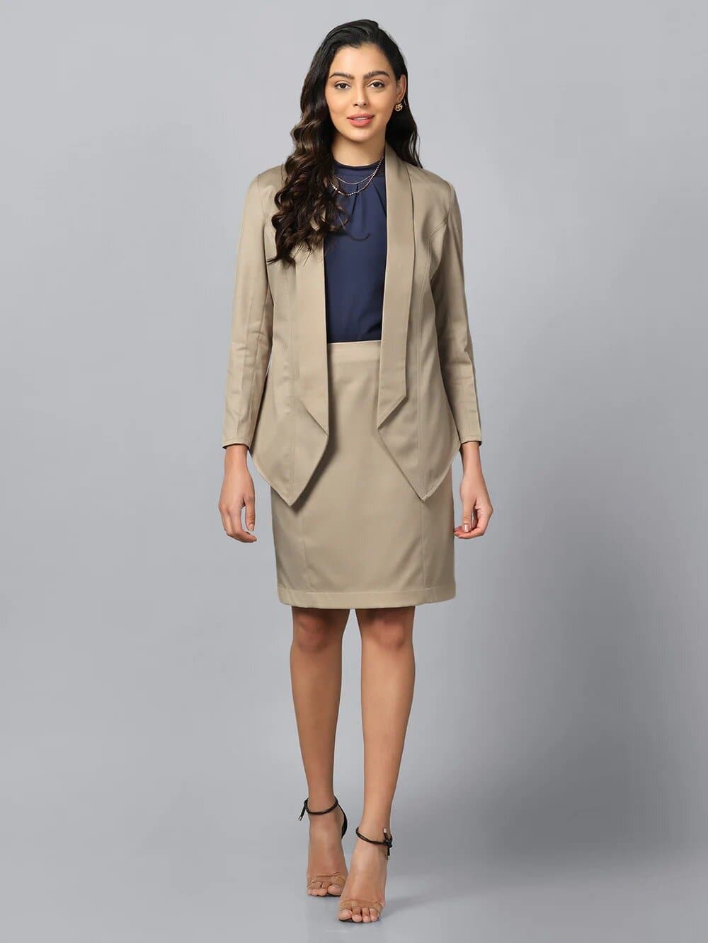 This elegant ensemble perfectly embodies fall formal sophistication. The neutral beige hue of the tailored blazer and pencil skirt creates a polished, monochromatic look that’s both timeless and on-trend for the season. The blazer’s draped lapels add a touch of effortless chic, while the fitted silhouette flatters the figure. Paired with a deep navy blouse, the outfit strikes a beautiful balance between warm and cool tones. Accessorized with minimal gold jewelry and strappy heels, this look is versatile enough for a variety of formal autumn events, from office parties to evening galas. It’s a head-turning choice that exudes confidence and style.