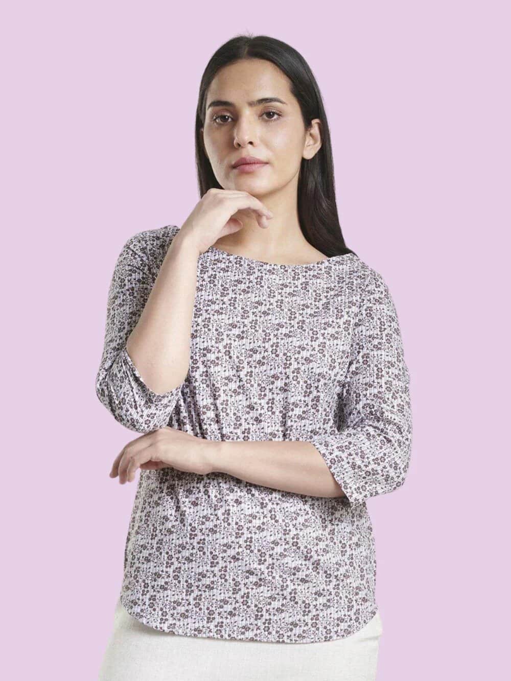 This sophisticated floral print blouse is a perfect addition to any fall formal wardrobe. The delicate pattern in muted tones of gray and burgundy creates a subtle yet eye-catching effect, ideal for autumn events. The loose-fitting silhouette with three-quarter sleeves offers both comfort and style, while the boat neckline adds a touch of elegance. Pair this versatile top with tailored trousers or a sleek skirt for a polished look that’s sure to turn heads. The blouse’s soft fabric drapes beautifully, flattering a variety of body types and making it a must-have piece for the season’s formal occasions.