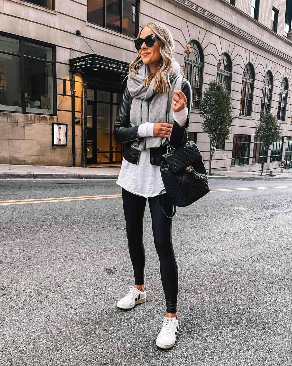This ensemble perfectly captures the essence of fall fashion with its stylish layering and versatile pieces. The outfit combines a sleek black leather jacket with a cozy grey scarf, creating a chic contrast of textures.