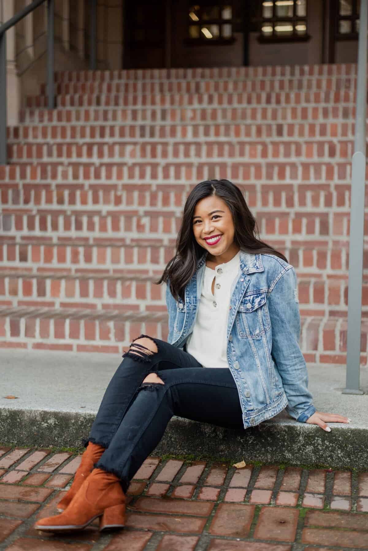 Paired with a simple cream top and distressed skinny jeans, this look strikes the ideal balance between casual and put-together. The ankle boots add a touch of sophistication, while the bold red lip brings a pop of color that’s quintessentially autumn.