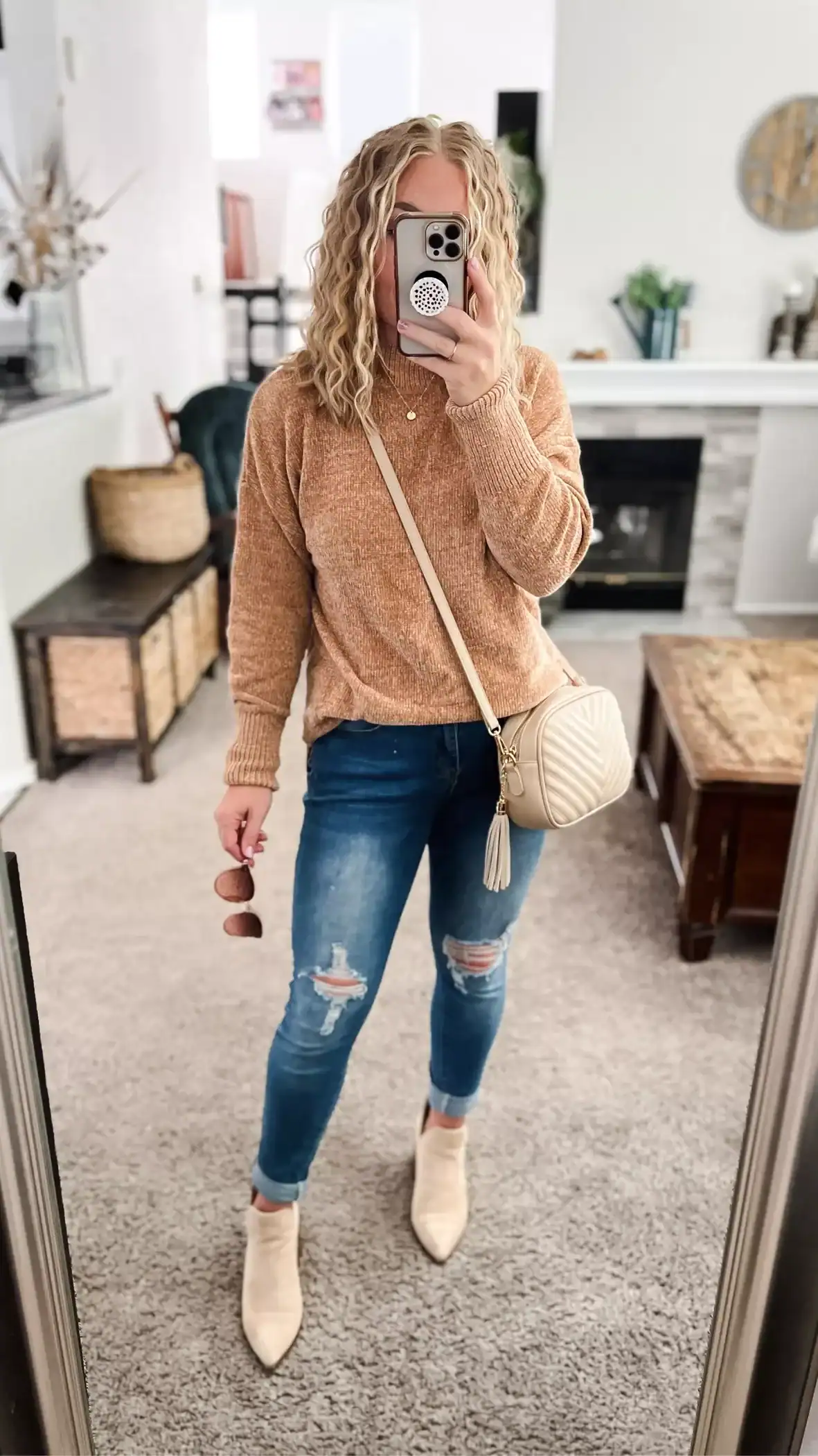 Paired with distressed skinny jeans, the outfit strikes an ideal balance between casual and chic. The neutral-toned ankle boots and matching crossbody bag tie the look together seamlessly, creating a cohesive and polished appearance.