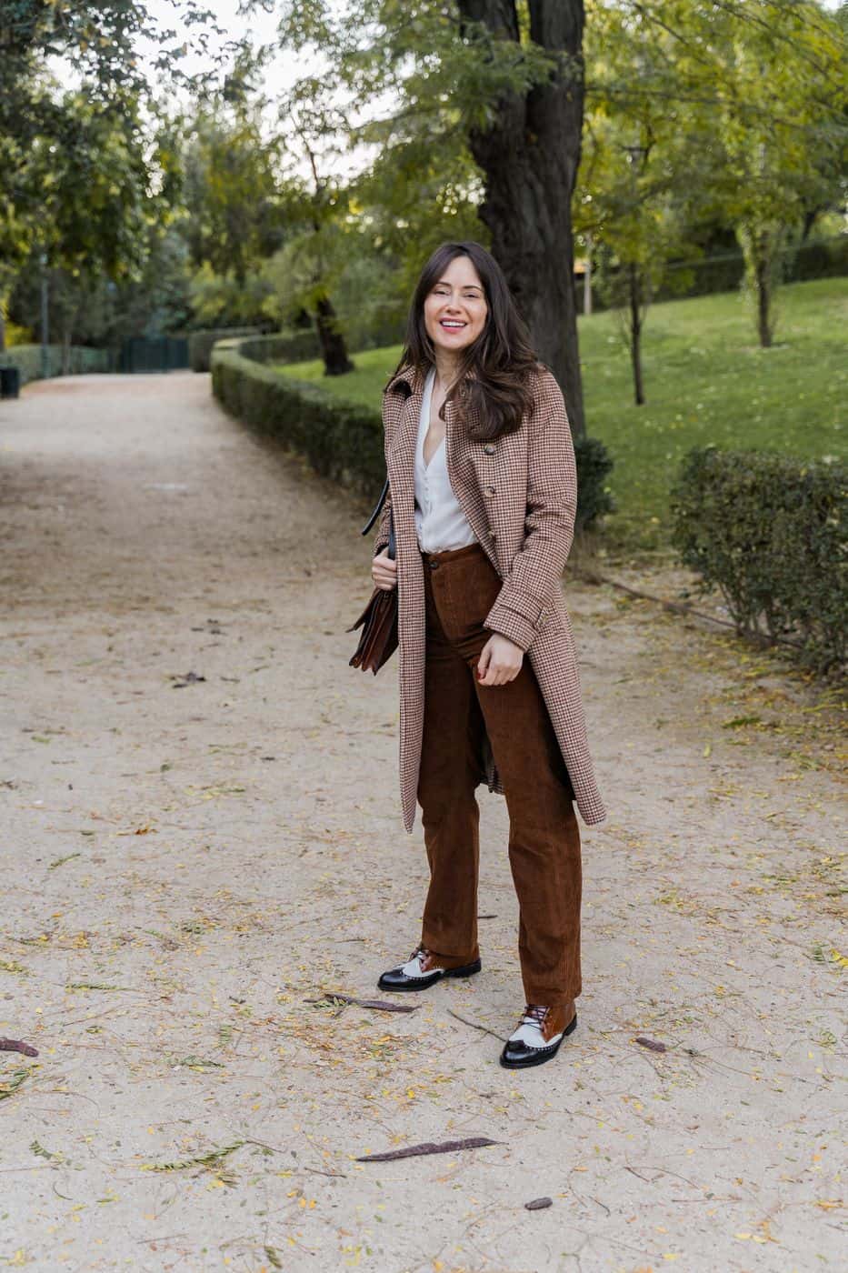 Paired with rich brown corduroy pants, the outfit exudes a cozy yet polished vibe. The crisp white blouse underneath adds a touch of elegance, while the two-tone brogues complete the look with a hint of vintage charm.