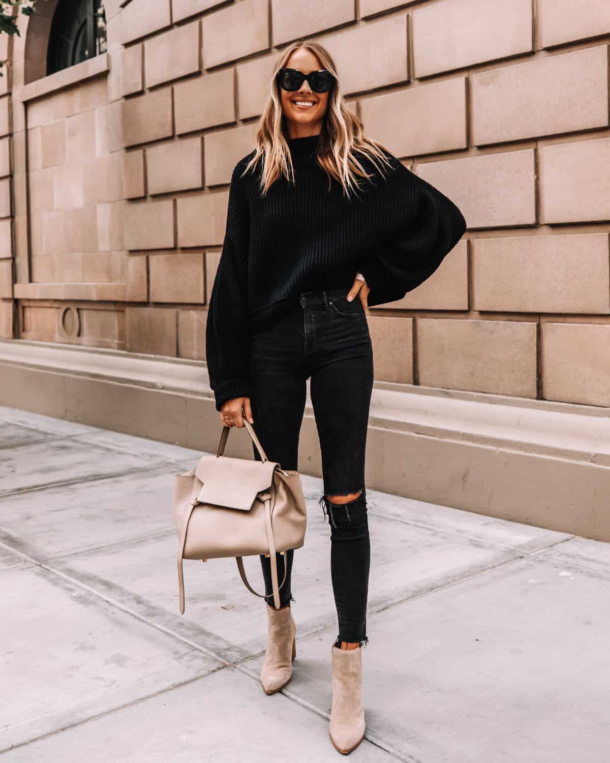 This stunning fall outfit exudes effortless sophistication with its all-black ensemble, perfectly balanced by neutral accessories. The oversized black sweater offers comfort and style, while the distressed skinny jeans add an edgy touch.