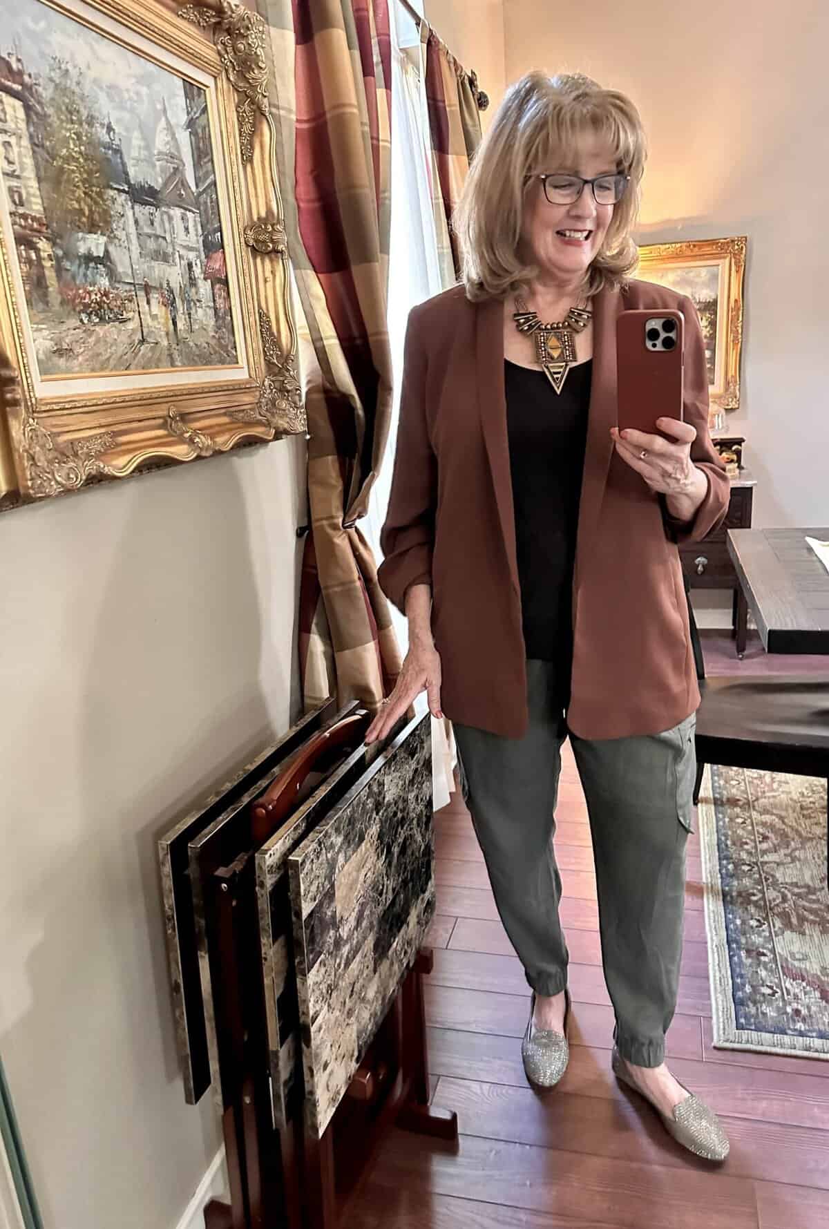 Elevate your fall wardrobe with this sophisticated ensemble that combines warm autumnal hues with effortless style. The rust-colored blazer adds a touch of elegance and warmth, perfectly complementing the olive green cargo-style pants.