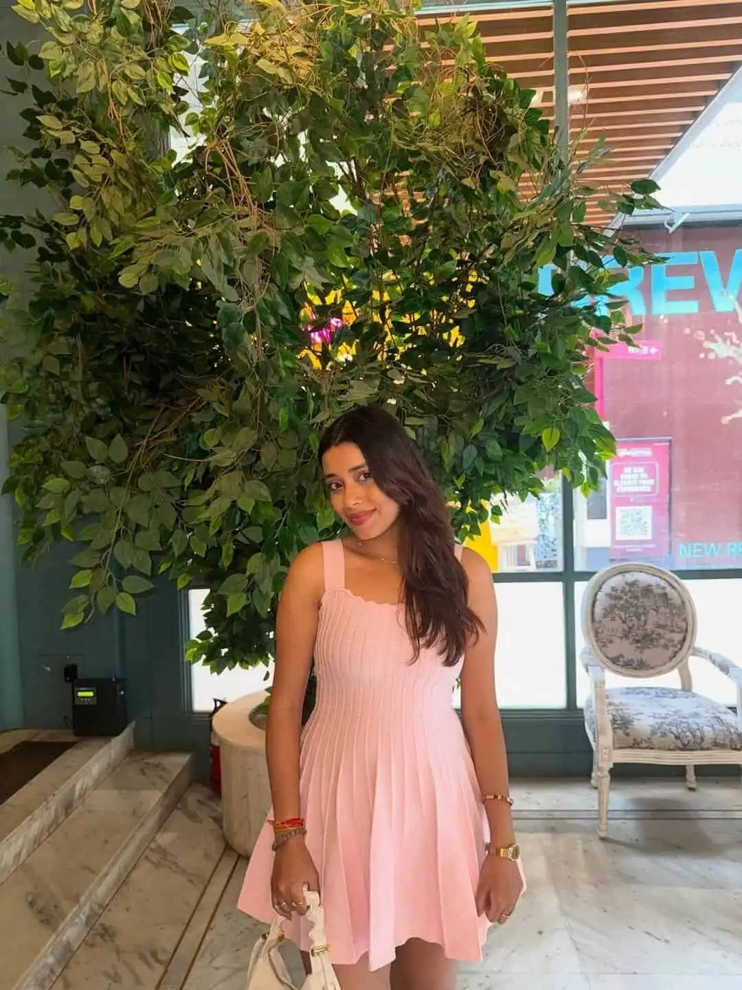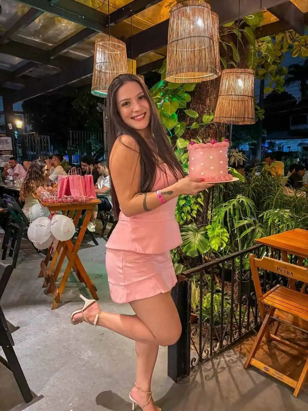 The tropical backdrop highlights the dresss versatility, suitable for both indoor celebrations and outdoor soires. This ensemble proves that a pink birthday outfit can be both elegant and eye-catching, ensuring youll feel like the star of your own celebration.