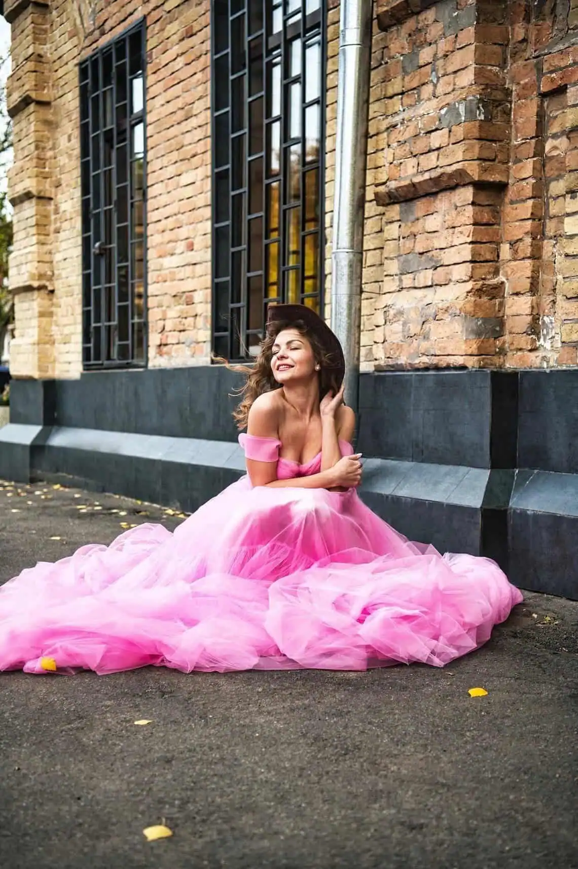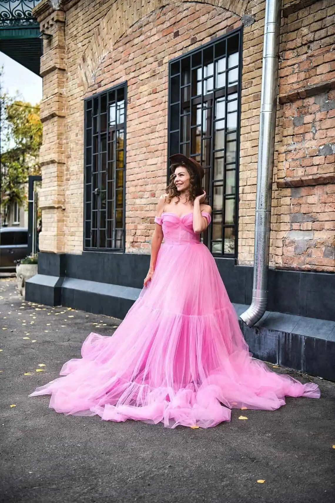 Make a statement on your special day with this breathtaking pink tulle princess gown. The off-shoulder design and voluminous skirt create a romantic, fairy-tale aesthetic thats perfect for a birthday celebration.