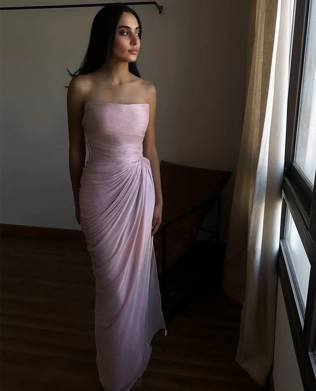 Elevate your birthday celebration with this stunning strapless pink gown that exudes elegance and grace. The soft, dusty pink hue creates a romantic and dreamy atmosphere, perfect for making your special day truly unforgettable.